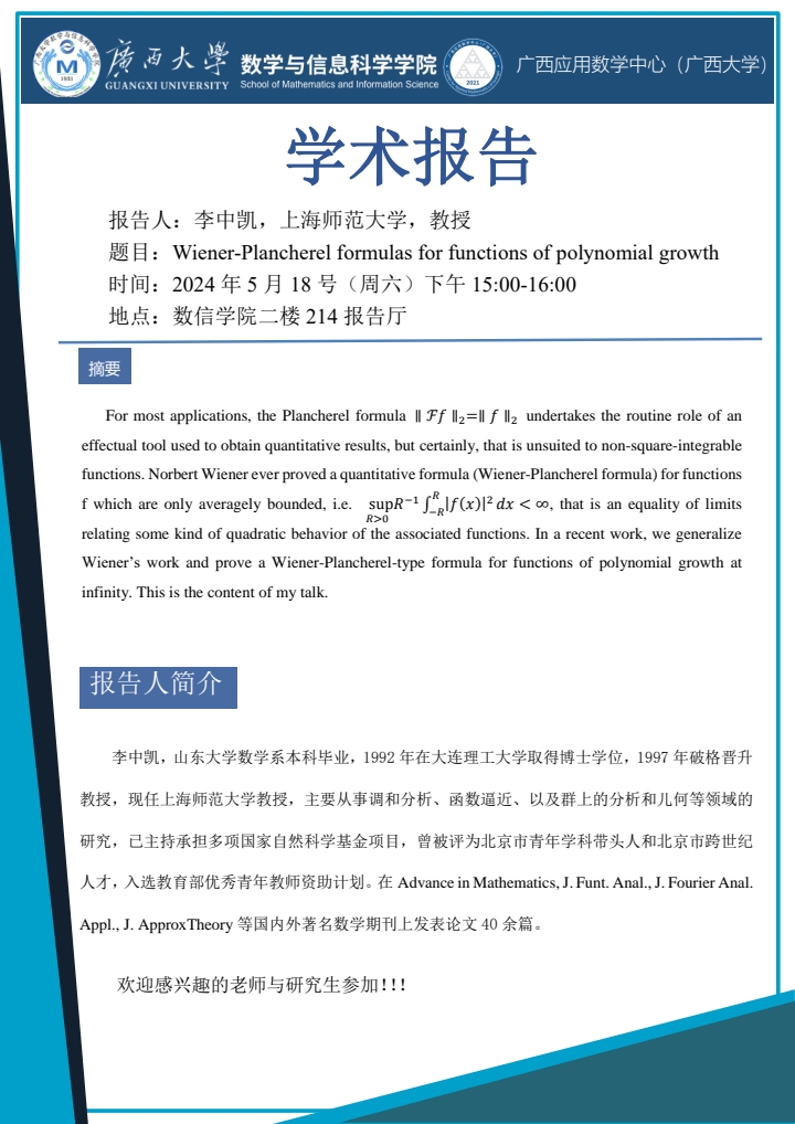 学术报告:Wiener-Plancherel formulas for functions of polynomial growth