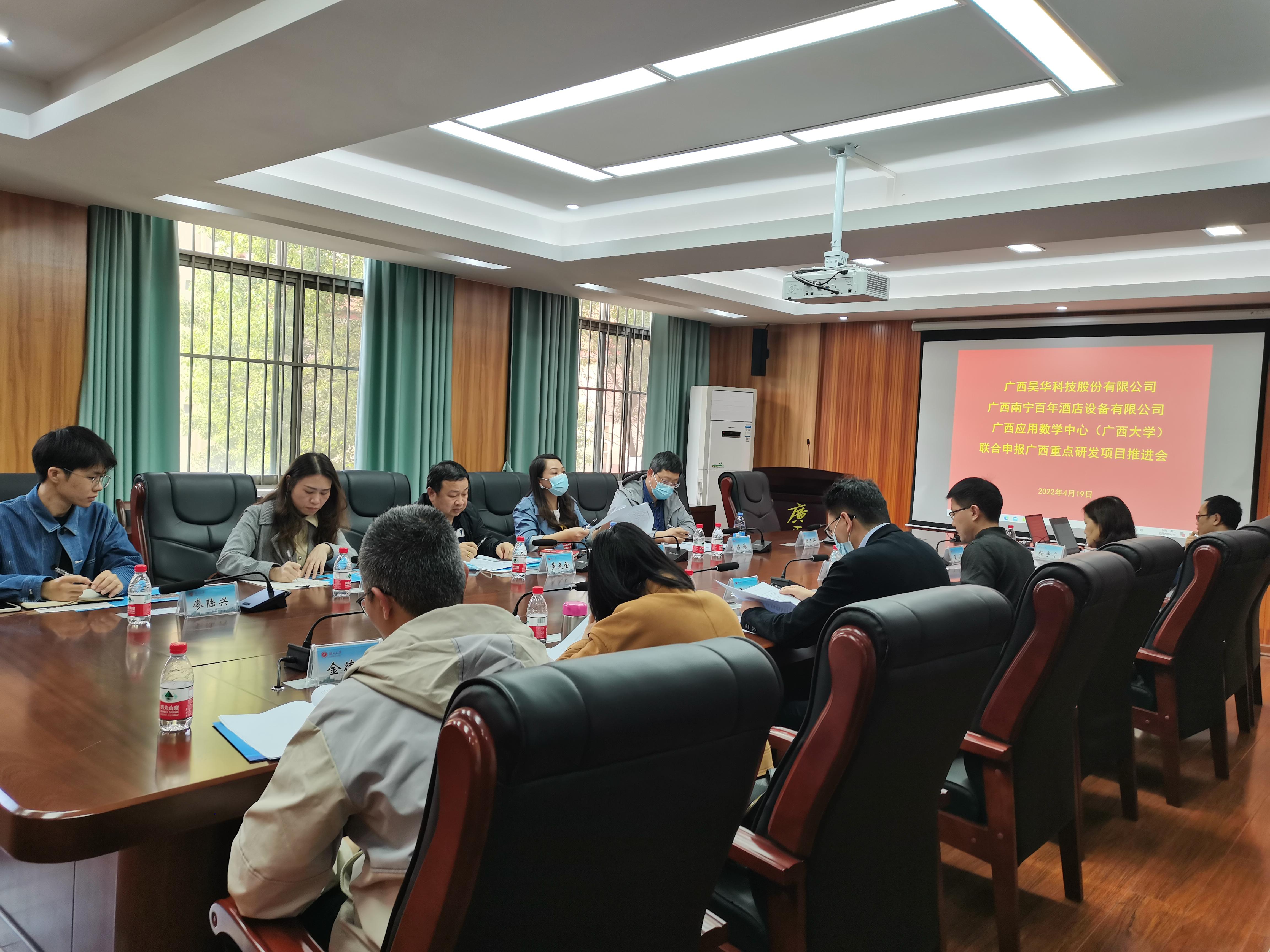 召开联合申报广西重点研发项目推进会。广西南宁百年酒店设备有限公司总经理黄连金、副总经理侯洁,广西优耐信息技术有限公司项目申报部经理梁晶,广西应用数学中心(小鸭看看