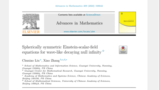 刘楚箫老师与张晓教授合作的论文“Spherically symmetric Einstein-scalar-field equations for wave-like decaying null infinity“被知名数学期刊《Advances in Mathematics》接受发表,张晓教授为该论文的通讯作者,这也是我校首次在此期刊接受发表论文。该论文研究了在零无穷远处具有波动型衰减的初值条件下的球对称爱因斯坦标量场方程的解的性质。论文证明了解的局部存在性与唯一性,小初值条件下的解的整体存在性与唯一性以及相关度量的完备性。文章的最后介绍了在这种条件下Christodoulou的广义解的定义并证明移除小初值的条件后,可以得到广义解。文章正式发表期卷号为: Advances in Mathematics,409(2022),108642。全文见//doi.org/10.1016/j.aim.2022.108642。