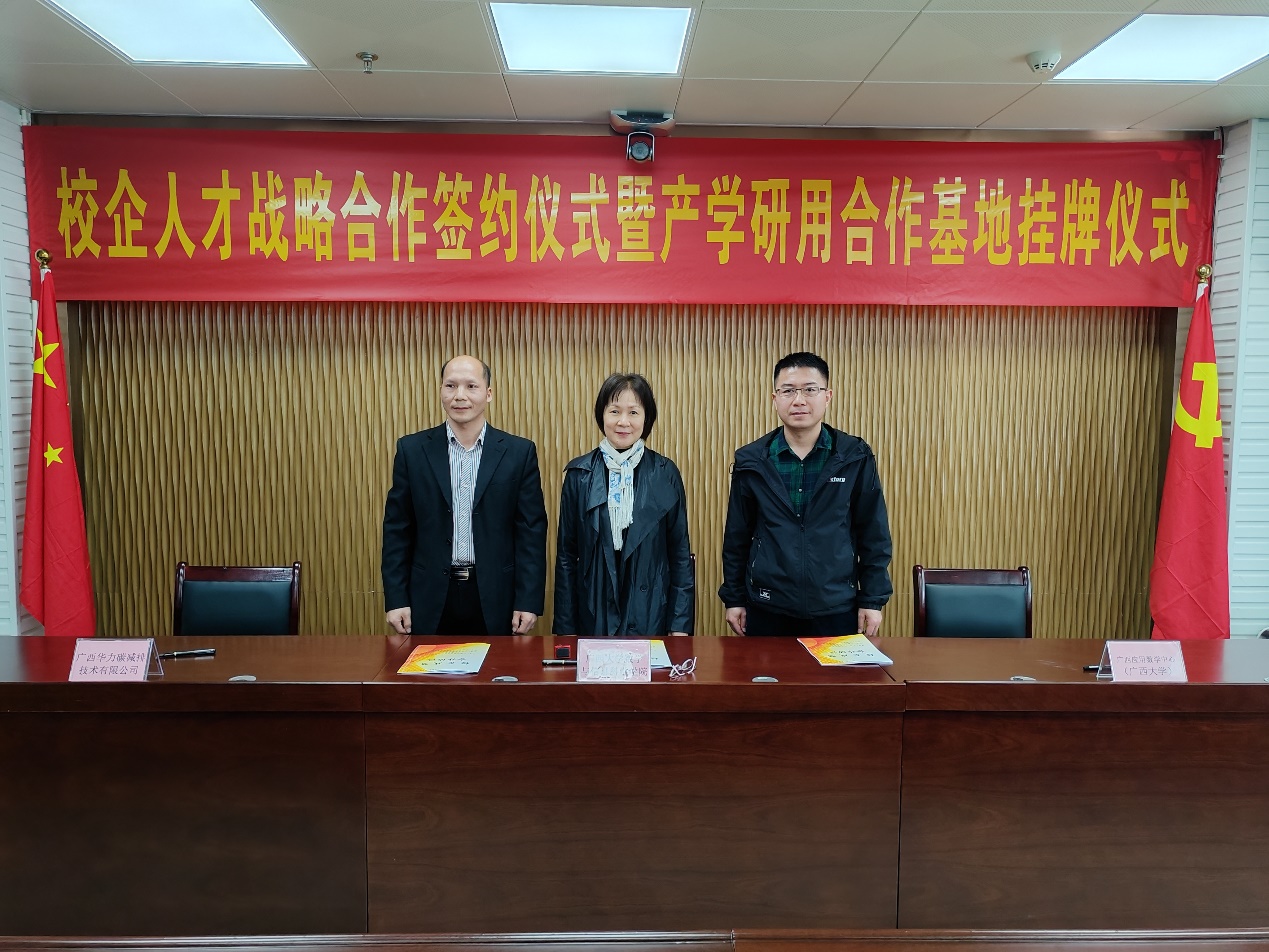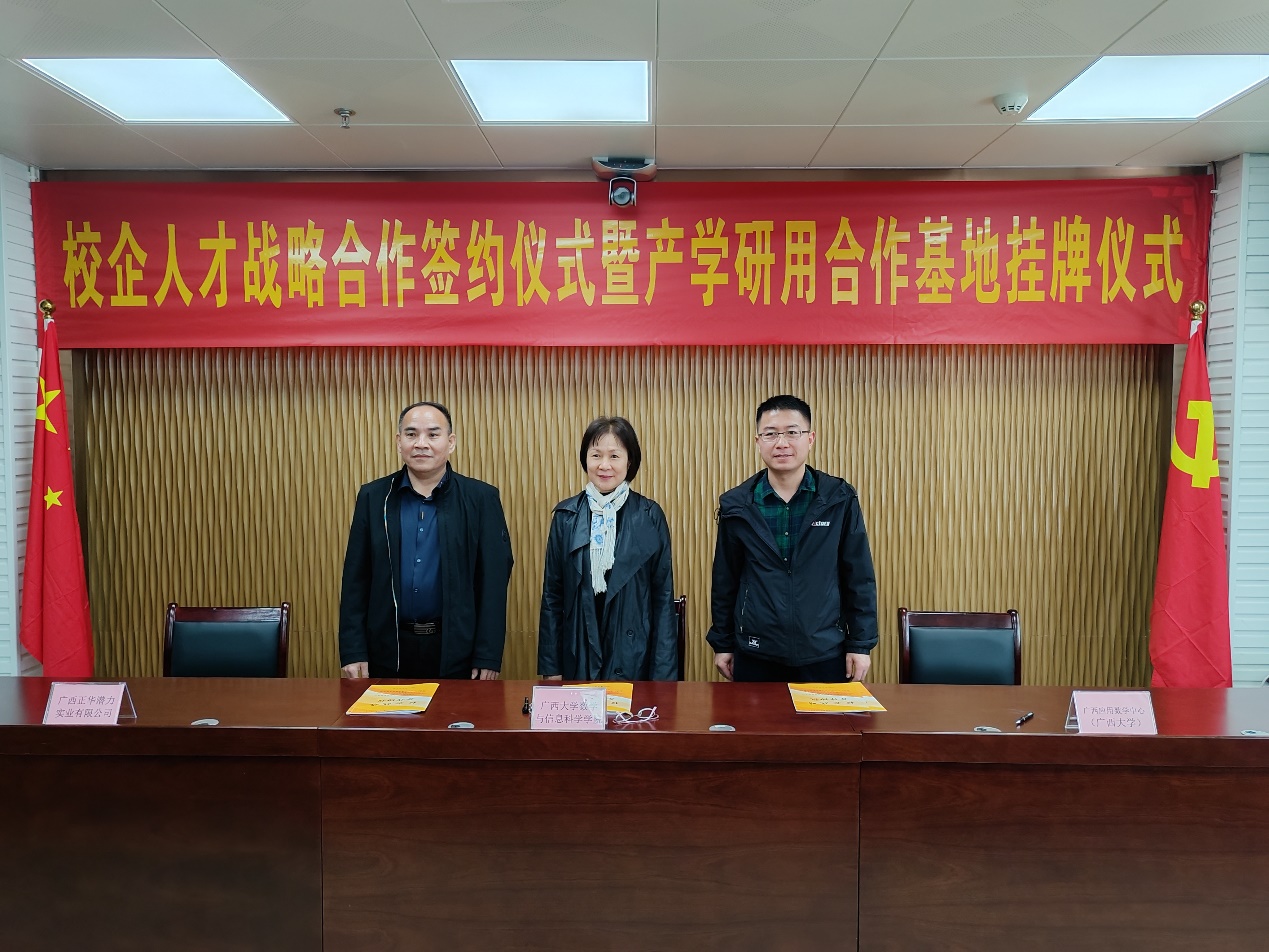 )分别与广西正华潜力实业有限公司、广西华力碳减排技术有限公司举行校企人才战略合作签约仪式暨产学研用合作基地揭牌仪式。院党委副书记郭海燕,副院长、广西应用数学中心(小鸭看看