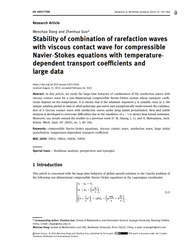 郭真华教授与其合作者,在流体力学方程稳定性、渗流问题上也取得一系列重要进展,其中以“Stability of combination of rarefaction waves with viscous contact wave for compressible Navier-Stokes equations with temperature-dependent transport coefficients and large data”为题的学术论文,发表在2023年的SCI一区学术期刊《Advances in Nonlinear Analysis》上。这项工作揭示了传输系数与温度相关的一维可压Navier-Stokes系统中稀疏波与黏性接触波组合的长时间行为。以“Global Well-Posedness of Coupled Navier-Stokes and Darcy Equations”为题的学术论文2024年1月被偏微分方程领域著名高水平学术期刊《Journal of Differential Equations》接受发表。这个工作揭示了石油开发领域中流体渗透过程的数学机理。