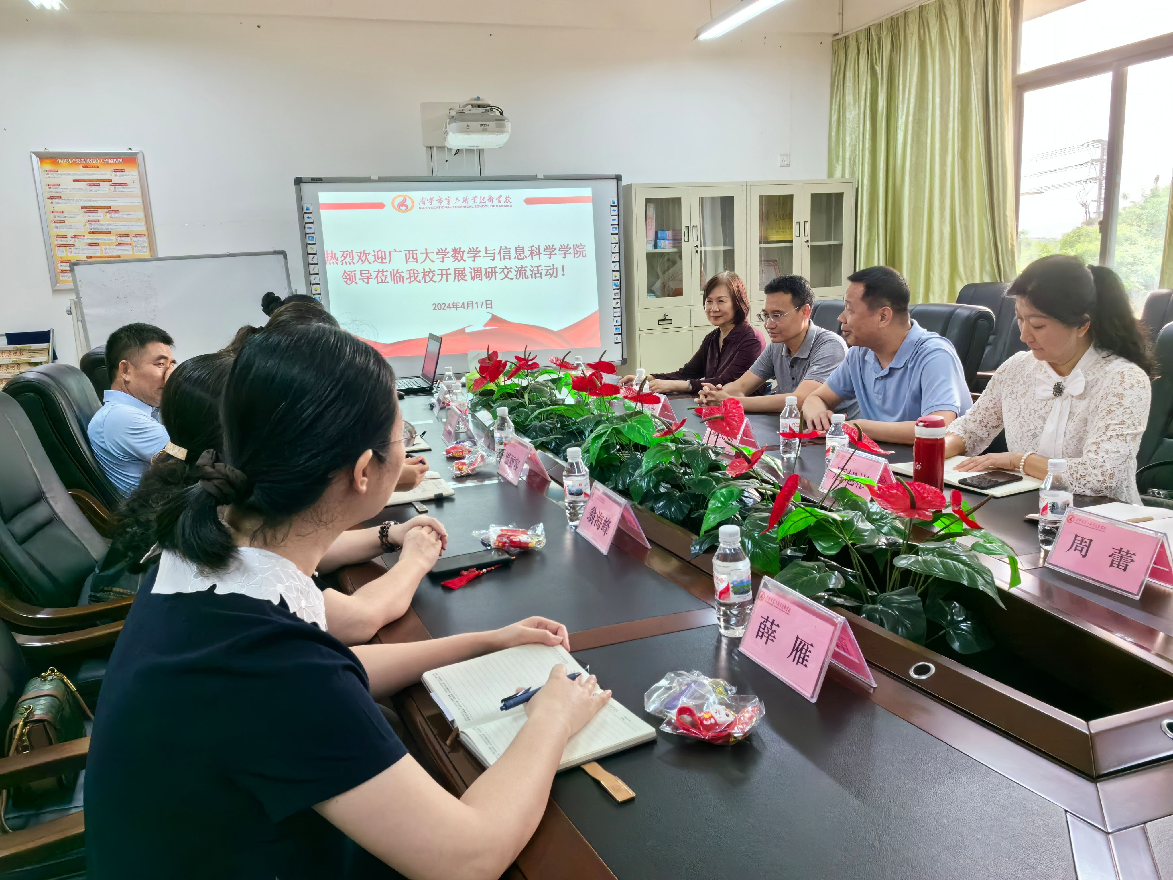 覃宪儒就近年来数信学院在学科建设、人才培养以及教学改革等方面取得的成绩作了介绍,希望双方建立常态化联系机制,推动校际资源共享、实习就业等方面的深度合作。温丽容介绍了学校发展历史、特色专业及人才需求等情况。