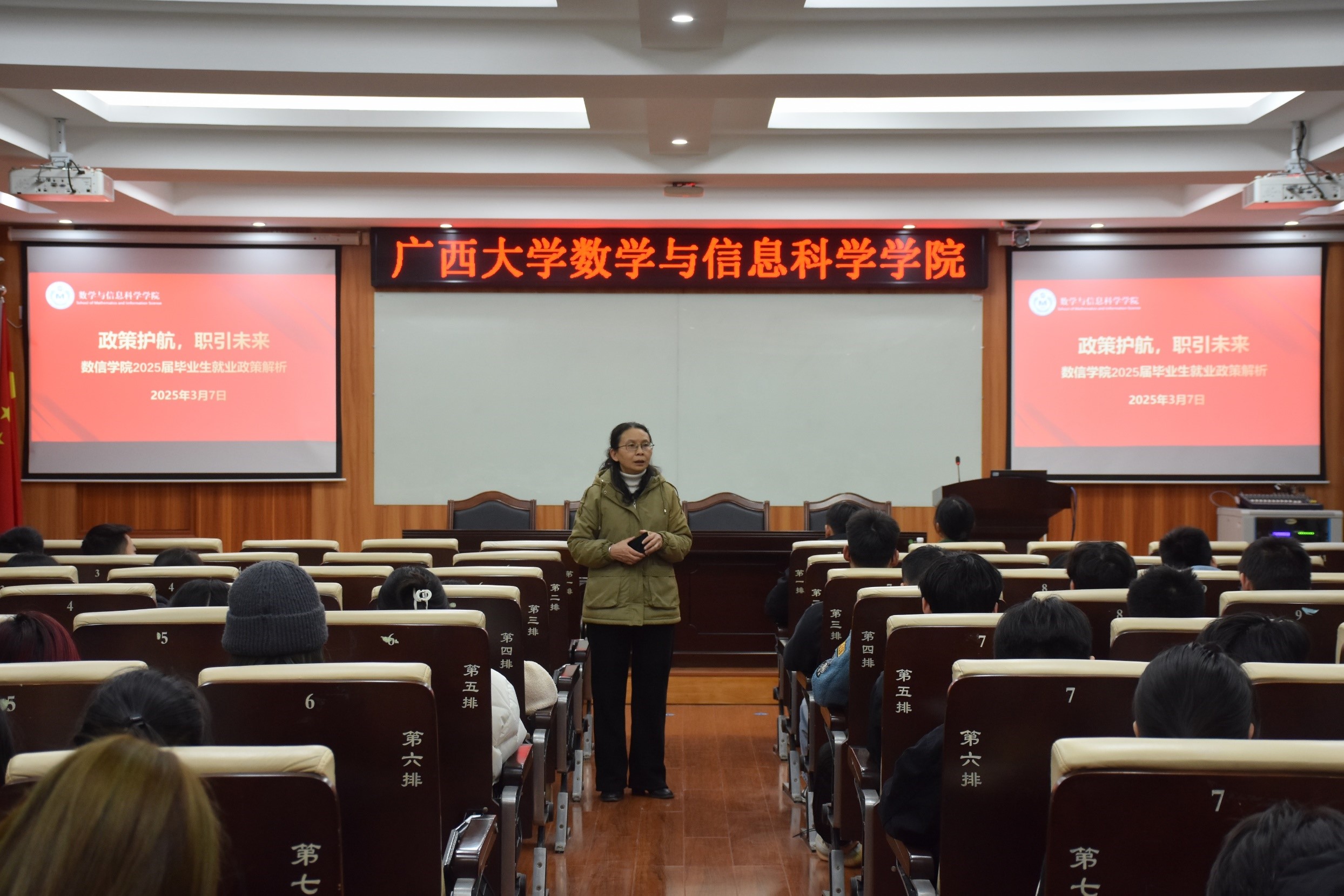 会上唐旭彬深入分析了当前的就业形势,她表示随着信息技术的快速发展、AI应用拓展和数字化转型的深入,数学与信息科学领域的就业前景广阔,但同时也面临着激烈的竞争。她鼓励毕业生们一要坚定信心,积极面对挑战,充分利用社会和学校提供的资源和平台,不断提升自己的综合素质和就业竞争力;二要保持乐观心态,对不同类型的工作岗位进行理性分析,根据个人兴趣和能力选择适合的职业道路。她引导毕业生们树立正确的就业观念,先就业再择业,在求职过程中应首先注重社会责任的担当,积极投身到国家和社会需要的基层地方,在创造社会价值的同时实现个人价值。