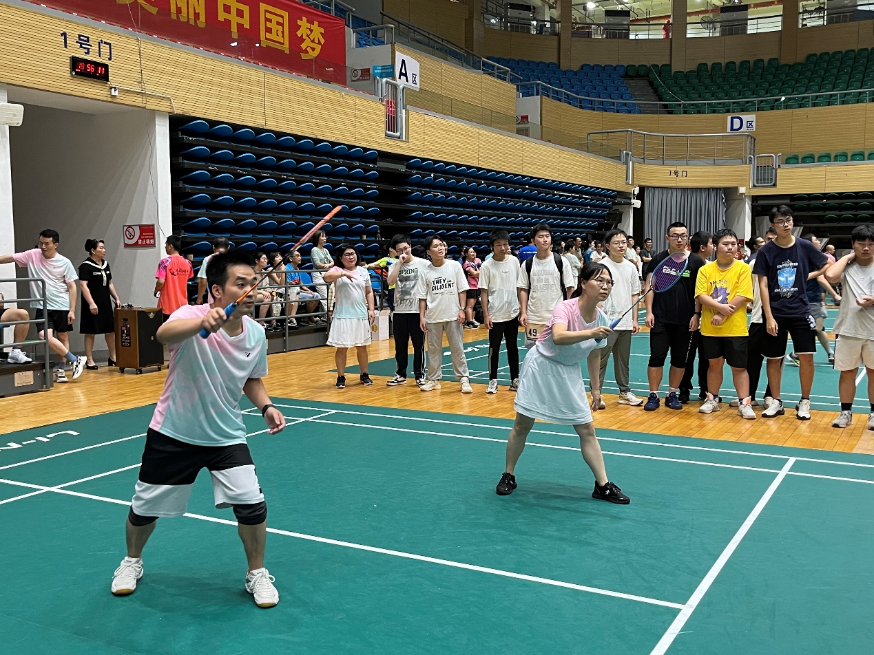 比赛以混合团体赛形式进行,设男双、女双和混双等项目,尽管老师们在年龄、身高等方面存在差异,但丝毫不影响赛场上的出色发挥。女双的联袂出击,男双的鱼跃扑救,混双的珠联璧合,队友们无声的默契,巧妙的配合,给在场观众带来一场场视觉盛宴,场外的学生啦啦队加油叫好此起彼伏。最终学院教职工羽毛球队以小组第一的成绩成功晋级第二阶段的比赛。