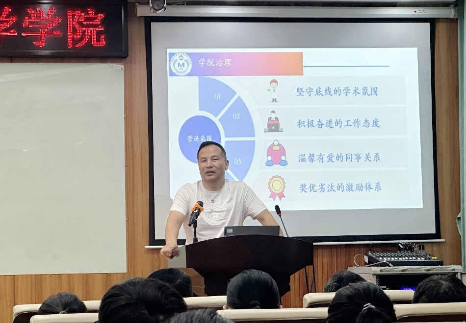 郭真华以“迈向十五五,学科建设再出发”为题,带领教师党员回顾了学院“十四五”建设历程,梳理了取得的成果和存在的短板,并深入分析了存在短板的原因;他还结合正在开展的数学学科广西一流学科验收、博士点合格评估和第六轮学科评估三项重点工作,分析了小鸭看看